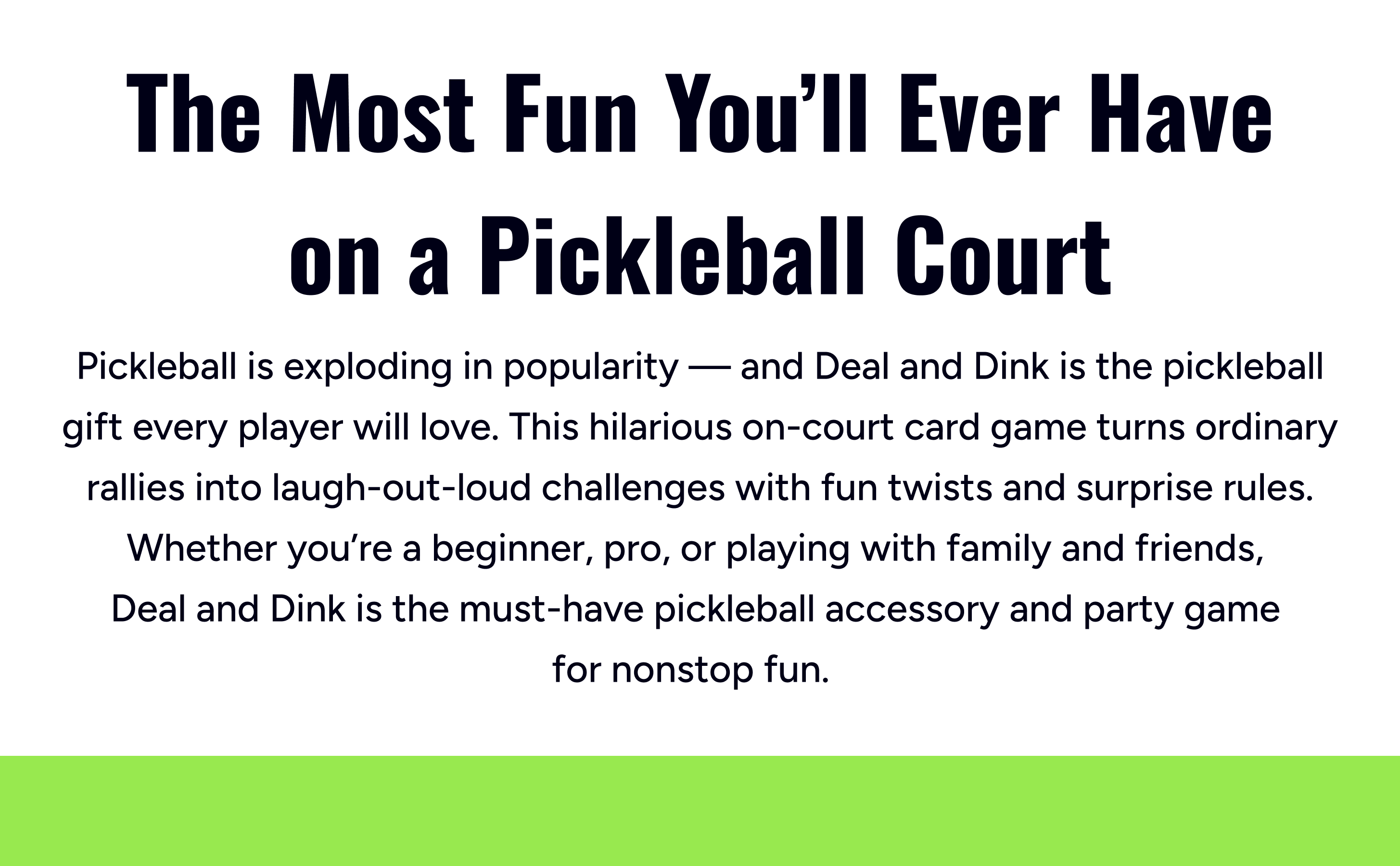 Meet Deal and Dink: the ultimate on-court pickleball card game with 50 unique challenges and twists designed to shake up your matches. It’s the perfect way to add laughter, energy, and friendly competition to your games — and guarantees rallies you’ll never forget.