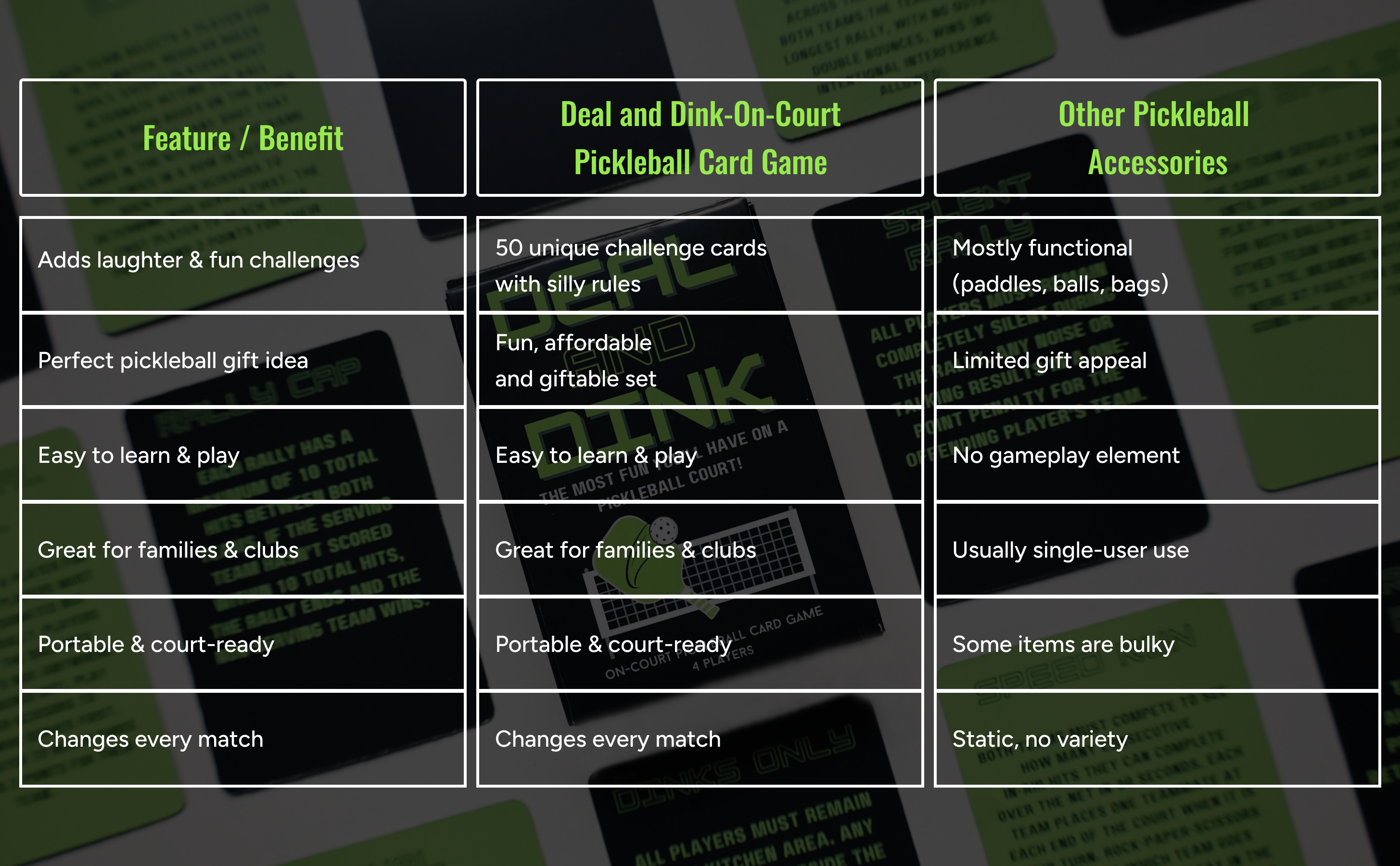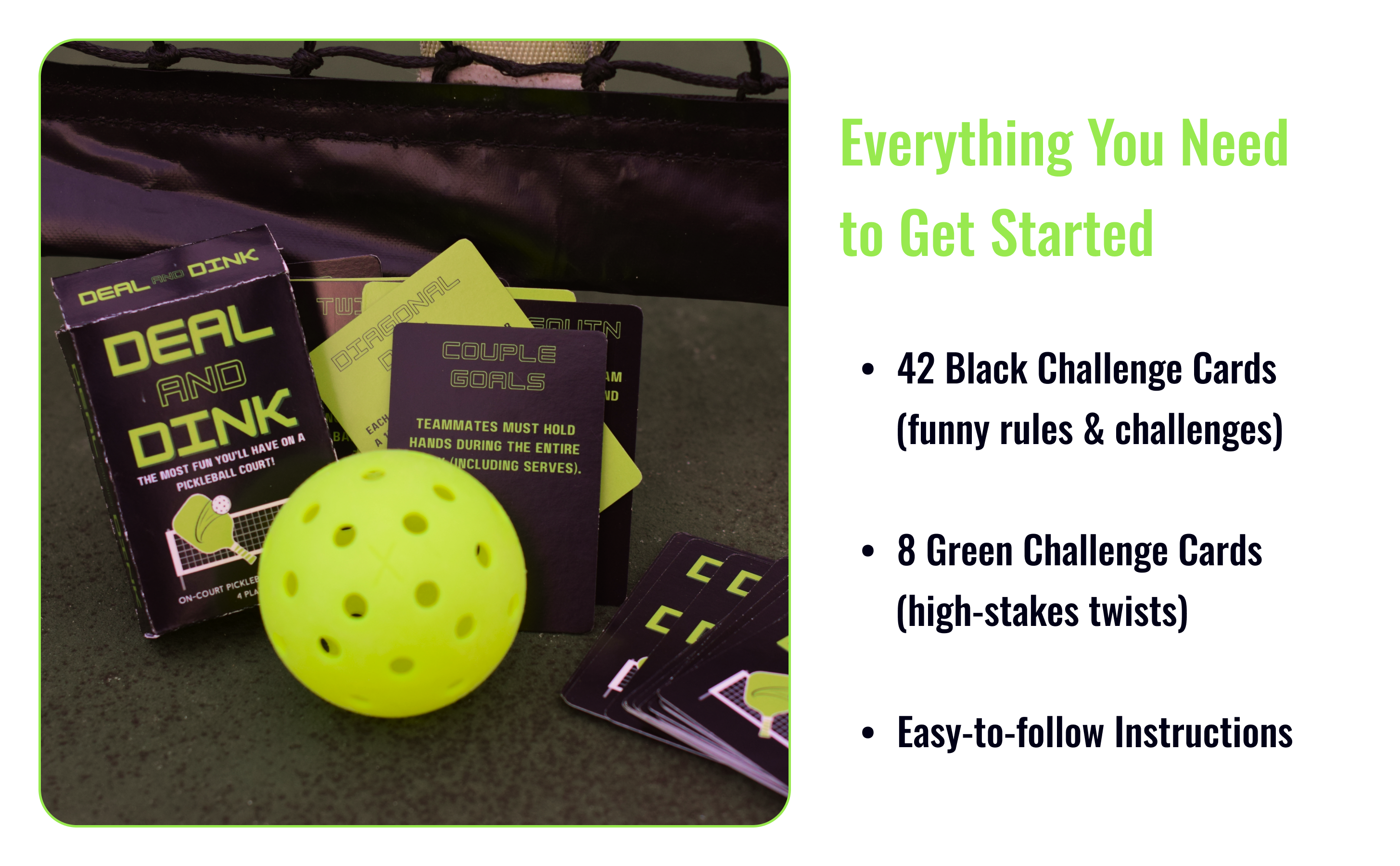 Everything you need to make pickleball more fun is right here. Just waiting for you to shuffle, deal, and bring new energy to the game with your friends, family, or club. After countless hours on the court, the Deal and Dink team has distilled all the laughter, challenges, and creative twists of pickleball into one beautifully designed game.